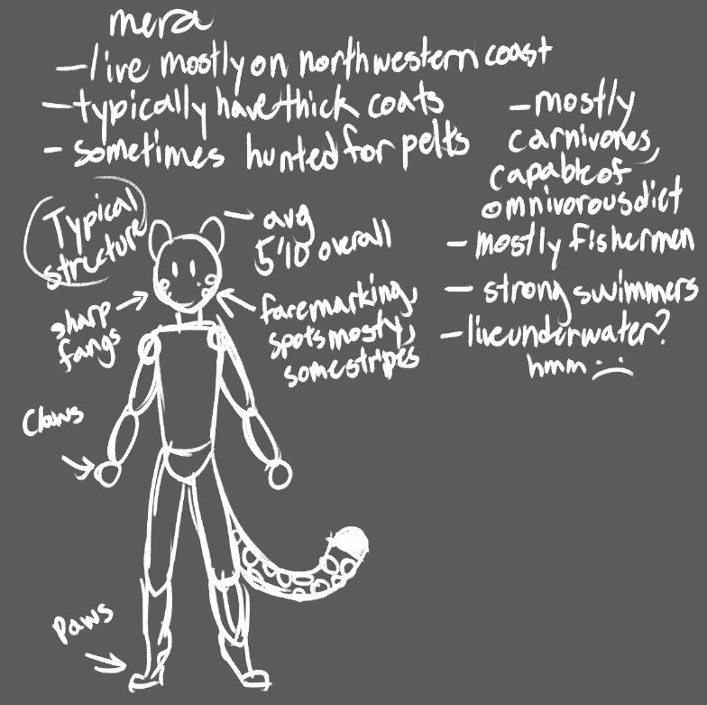Having previously been hunted for their tails, many Mera are wary or outright hostile to humans, but some have migrated into the more populated city states of Sreng.